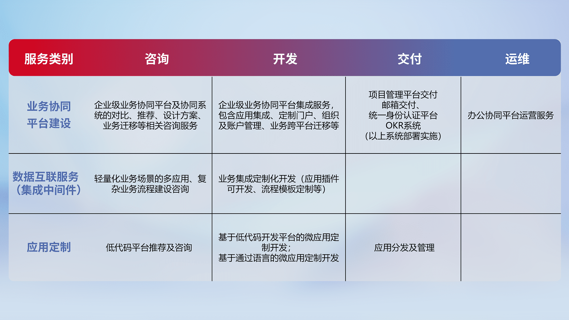 针对钉钉、、、企微、、、、IDaas等平台级产品提供产品的规划、、、、方案、、、、交付、、、、定制化开发等服务,,,实现如统一协同办公、、、、智能客户服务、、混合会议管理、、、、智能数据查询、、、等业务场景,,,,实现数字化转型。。